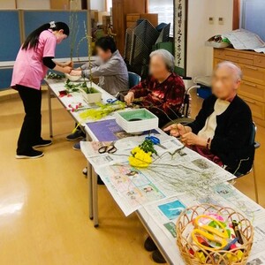 見学の方も数名おられ、明るく華やかな雰囲気の中、皆様思い思いに楽しんでいらっしゃいました。準備と片づけ、できないところは職員が介入させて頂きながら、皆様作品を作り上げられます。作品は各フロアに飾らせて頂き、参加されない方も作品を楽しみにしておられます。